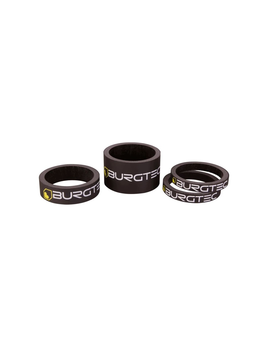 Arandelas Burgtec de fibra de carbon. El pack incluye dos arandelas de 5 mm, una de 10 mm y otra de 20 mm.