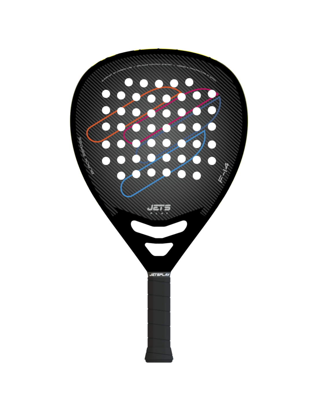 Pala de pádel de diamante Jets Play F-23. Pala de fibra de carbono perfecta para jugadores de nivel alto que busca una pala reactiva, de balance alto y que favorezca un golpeo potente.